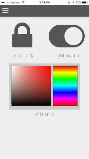 The control panel provides an interface for controlling the various hardware components in the room. It also provides a visualization of the current state of each device (in the image above the door is locked, the overhead lights are on, and the LED strip is off).