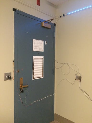 A continuous rotation servo winds and unwinds a cable to move the door handle. To unlock the door, the servo winds the cable until a magnet on the door handle trips the reed switch (magnet sensor). To lock the door, the servo unwinds the cable for 2 seconds.